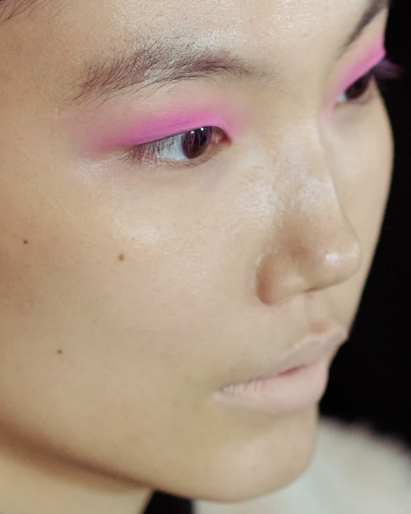 The scene at Brandon Maxwell, which called for a 9:30am arrival time backstage, was surprisingly chill—the backstage theatrics we were promised from the likes of Project Runway and America’s Next Top Model were nowhere to be seen. Instead, lead makeup artist Fulvia Farolfi and her team quietly plugged away on a very minimal look. The drama-free makeup was anchored by a wash of Merit products, including their much-talked-about blush balm in Terracotta, which, after a hiatus, returned to store shelves just in time to coincide with fashion week. On nails, Jin Soon went for a bare look that was not actually bare—a clear matte top cat was involved. And then there was the hair, which also kept a literal low profile in a neck-grazing bun.