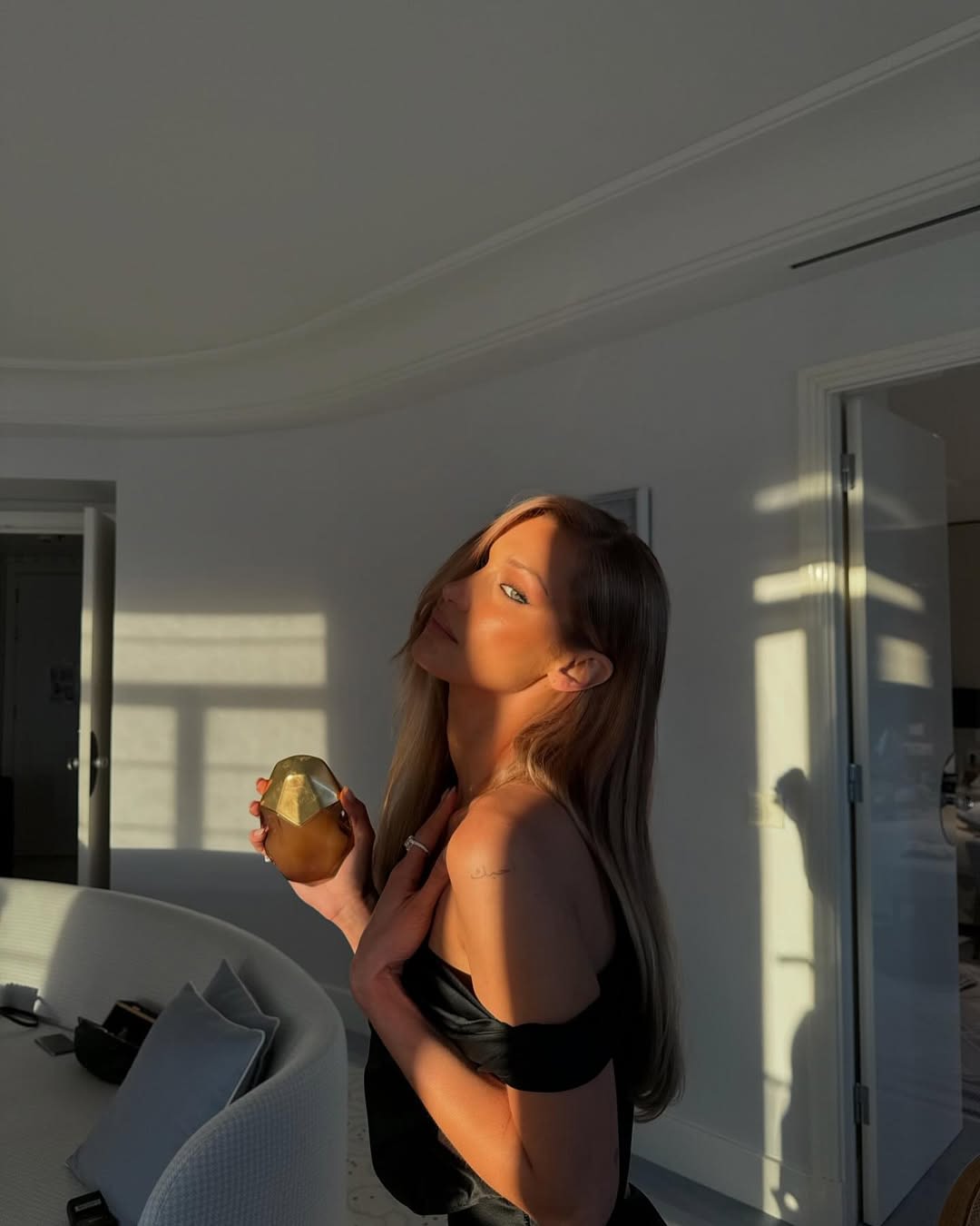 Bella’s super creative and inspiring to work with. She loves a good moodboard, so that’s where we started. We looked at a bunch of photos of Brigitte Bardot with darker blonde hair and Gisele Bündchen in the ’90s and early 2000s. I also looked at Bella’s baby photos because she’s a natural dark blonde—if you’re thinking of going back to your natural hair color, you have to do that. After years of highlights and dye, your original shade can get lost, so it’s important to ground your vision in something real.