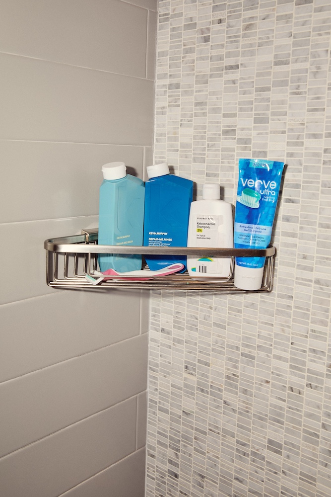 When it comes to my daily routine, my dog, Pinky, wakes me up at 8AM like clockwork. We’ll go downstairs, take a walk, get a coffee, and then come back to use my rose quartz roll—I keep mine from Jenny Patinkin in the fridge. Then I wash my face. The dermatitis I developed a couple of years ago makes my skin look really dry, but what’s saved me is my prescription shampoo, which I use as a face wash because the 2-percent ketoconazole in it keeps my dermatitis under control.
