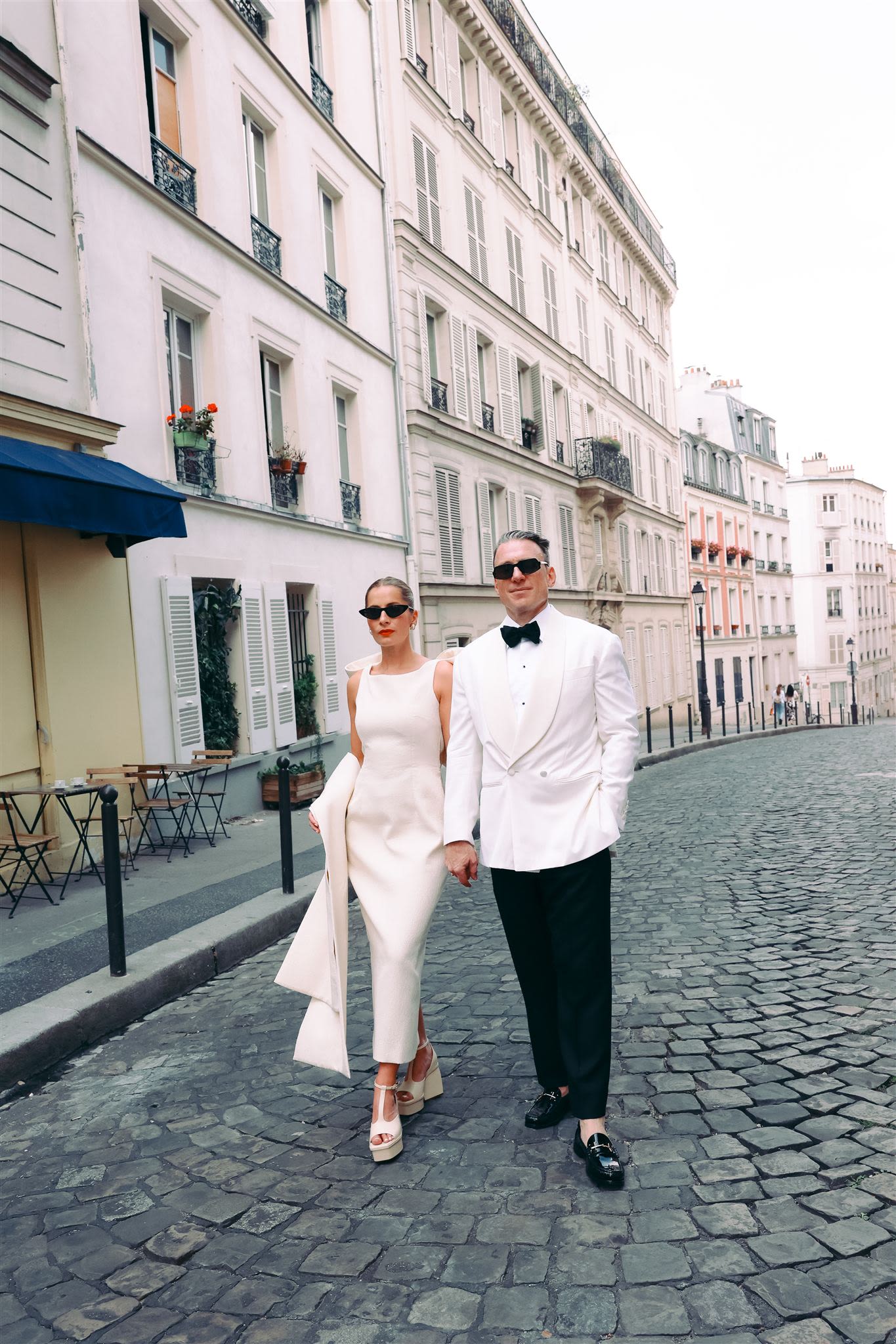 We chose Montmartre for its village vibe. I hired a planner to help with the language barrier and bring my “non-wedding wedding” vision to life. I told her, “I hate weddings. No round tables, no favors.” She delivered. The ceremony was held at the Museum of Romantic Life, a gorgeous old building with gardens and Parisian rooftop views. From there, two little white petit trains ferried guests to the reception at a coffee shop halfway down the Sacré-Cœur steps—when she pitched it to us, our wedding planner said, “I’ve got something slightly controversial.” The upstairs space was a blank canvas with a terrace that overlooked both the basilica and the Eiffel Tower. It was absolutely magical.