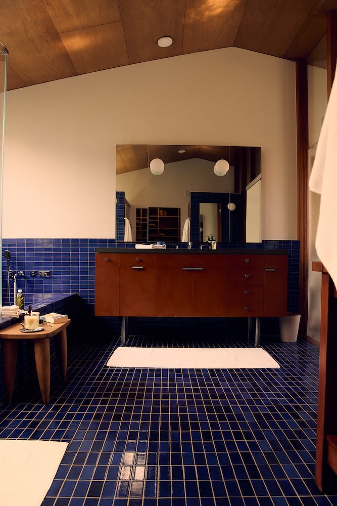 “My husband and I moved into our LA home five years ago. It already had great bones—including a beautiful red bar cabinet—and a strong design sensibility. When we redid the bathroom, I wanted to keep the spirit of the house, so I swapped the old washed-out blue tiles for a punchy Yves Klein blue I’ve always loved. I wasn’t thinking about creating content when I put them in, but people really respond to it online—design has taken a turn, and people are finally starting to move on from the sad beige look.