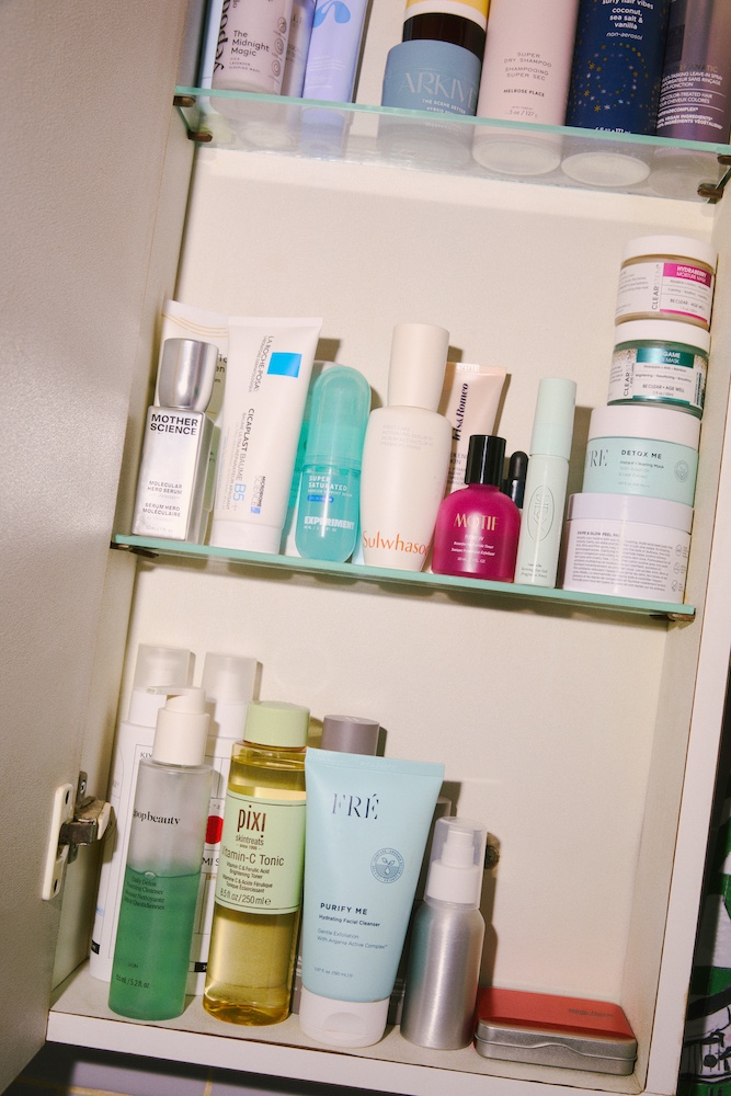 At night, I use a foaming cleanser—Fré’s Purify Me or Goop’s Daily Detox—and an oil-based one. The balm I’m testing right now is crap; you know when your skin never feels quite clean, like there’s a film? But I generally like the True Botanicals balm. Then toner: Motif’s resurfacing one is a great acid that doesn’t smell as wild as Biologique Recherche P50. Serum-wise, I’m using Sulwhasoo’s First Care Activating serum for sunspots and hyperpigmentation. I like Sulwhasoo formulations in general—the textures are lightweight. I find that some serums can be a little sticky or heavy, but this one just kind of disappears. Mother Science’s Molecular Hero serum also helps with pigmentation.