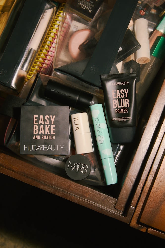 My makeup looks best when I take my time—color-correcting, layering, doing all sorts of things. I also shower and get ready at the gym every day, so everything has to fit in something slim. I’m testing different foundations right now. I went to Sephora and grabbed a bunch of samples of whatever the girlies are talking about—Patrick Ta Major Skin, Haus Labs Triclone Skin, the usual suspects. Before any of that, it’s either the E.l.f. Power Grip primer or Huda Beauty’s Easy Blur.